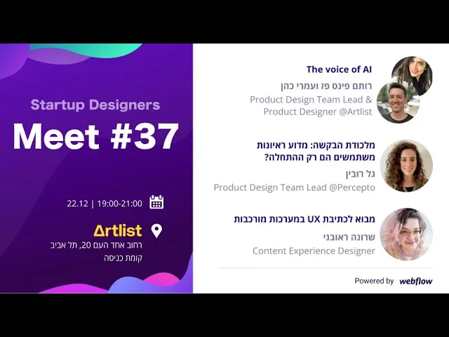 רותם פינס פז ועמרי כהן | The voice of AIבהרצאה נעמיק בהיצע המגוון של ארטליסט, עם דגש מיוחד על הקטלוג של האסטים באתר. נחקור כיצד הבינה המלאכותית ממלאת תפקיד משמעותי בקטגוריות השונות, ונציג את המסע שעברנו בפיתוח פיצ'ר חדש בקטלוג. פיצ'ר זה מאפשר יצירת קולות בצורה מהירה, קלה ואיכותית, ונתמקד בתהליך העבודה ובחשיבה העיצובית מאחורי הכלים הללו.גל רובין | מלכודת הבקשה: מדוע ראיונות משתמשים הם רק ההתחלה?משתמשים תמיד יודעים מה הם צריכים, או לפחות חושבים שהם יודעים. אם רק תשאלו אותם הם יציגו בפניכם רשימה של פיצ׳רים, כפתורים ועצים (עצים?!) שמומלץ להטמיע במוצר כדי שהוא יהיה מושלם. אבל האם באמת כדאי להקשיב לבקשות האלו?בהרצאה אני אציג שני מקרי בוחן שדרכם נלמד כיצד לתרגם בקשה של משתמש להזדמנות, מה השלבים הבאים אחרי ראיון משתמשים ומה המחיר של הקשבה מוחלטת למשתמש.שרונה ראובני | מבוא לכתיבת יו אקס במערכות מורכבותבהרצאה זו נבחן את העקרונות המרכזיים של כתיבת UX ונבין מה מייחד כתיבה למערכות מורכבות בהשוואה לאפליקציות B2C. נעמיק בהבנת תפקידו של מעצב חוויית התוכן ונדון בדרכים לפשט רעיונות ותהליכים מורכבים עבור משתמשים מומחים, תוך שמירה על חוויית משתמש חלקה ויעילה.חלק א - https://youtu.be/ZCiyW7ndbaA?si=zf9amZRKx-uySB4vחלק ב - https://youtu.be/Yk3EFFgGjNM?si=pjLw5kWhgcisxvQ_חלק ג - https://youtu.be/G83ZbZQIC7E?si=zSeyQhCjXC2RC923